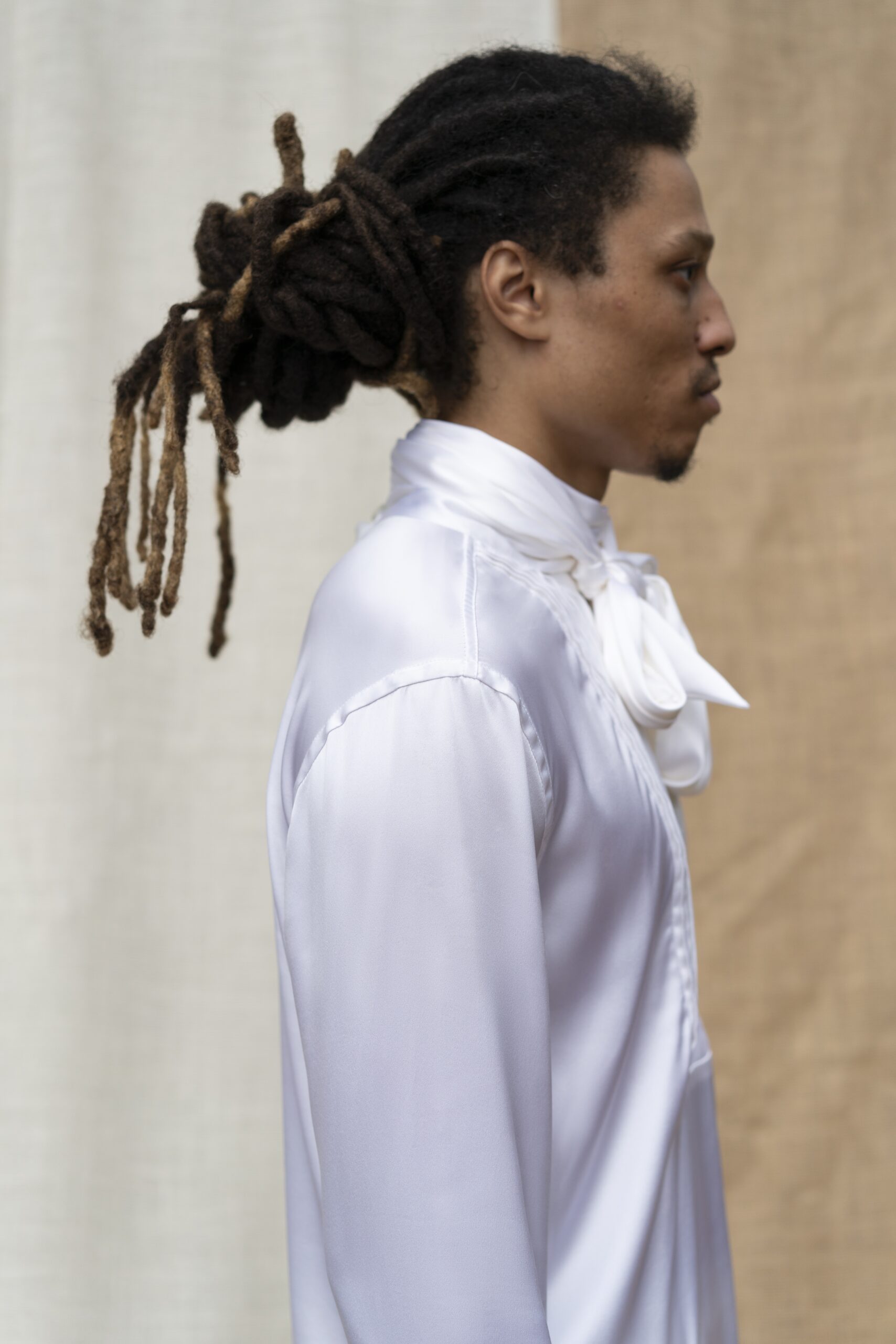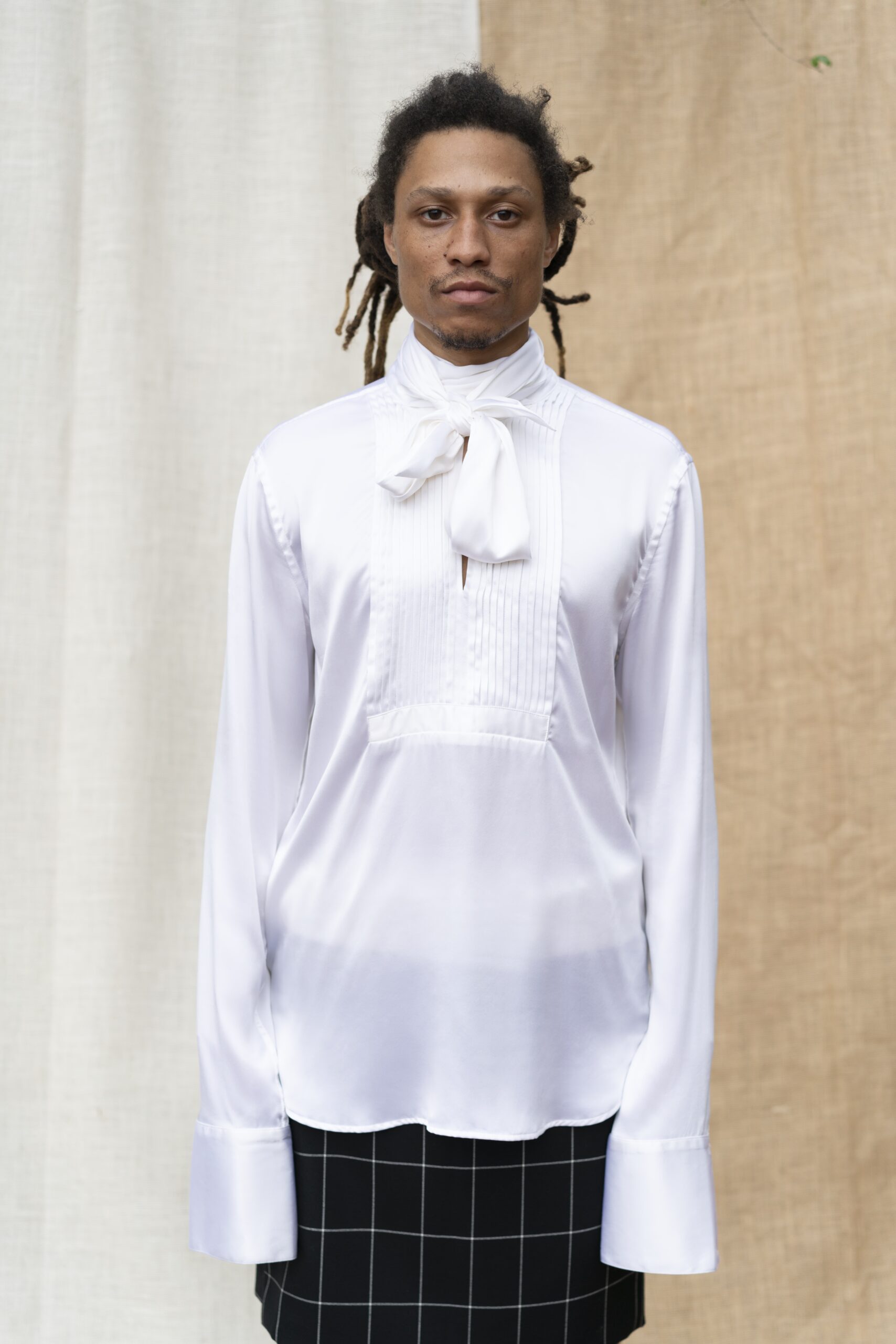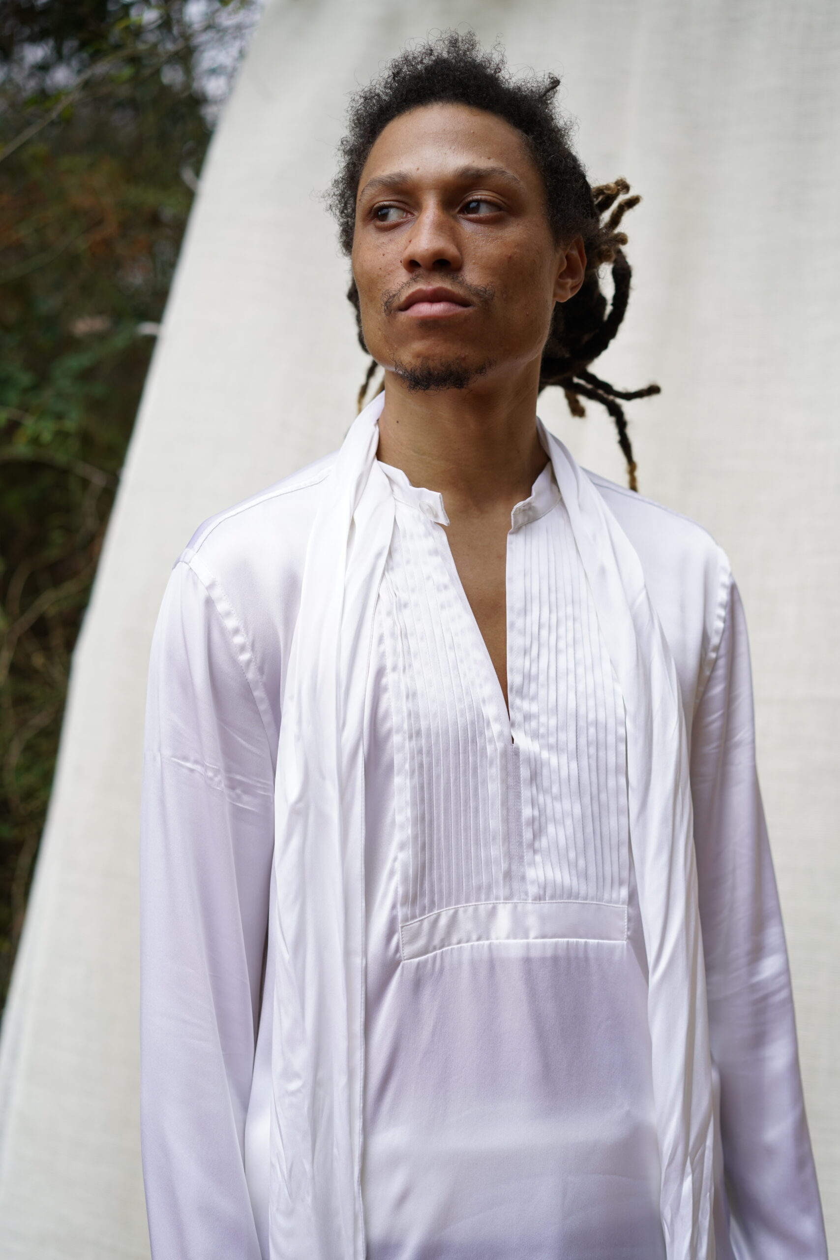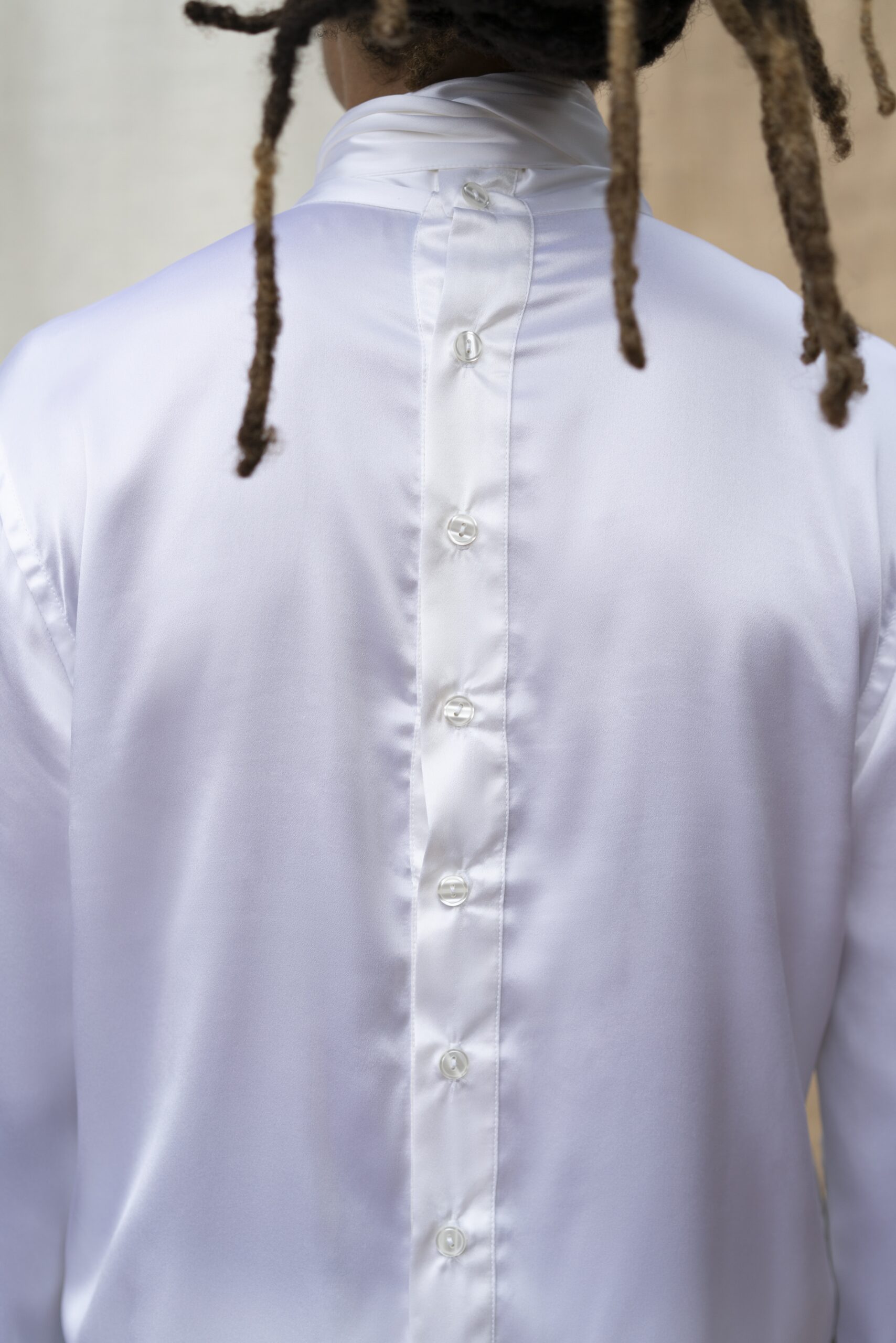 Pleated panel at yoke. Signature elongated sleeves. Double barrel French cuffs. Exposed button closures at back.