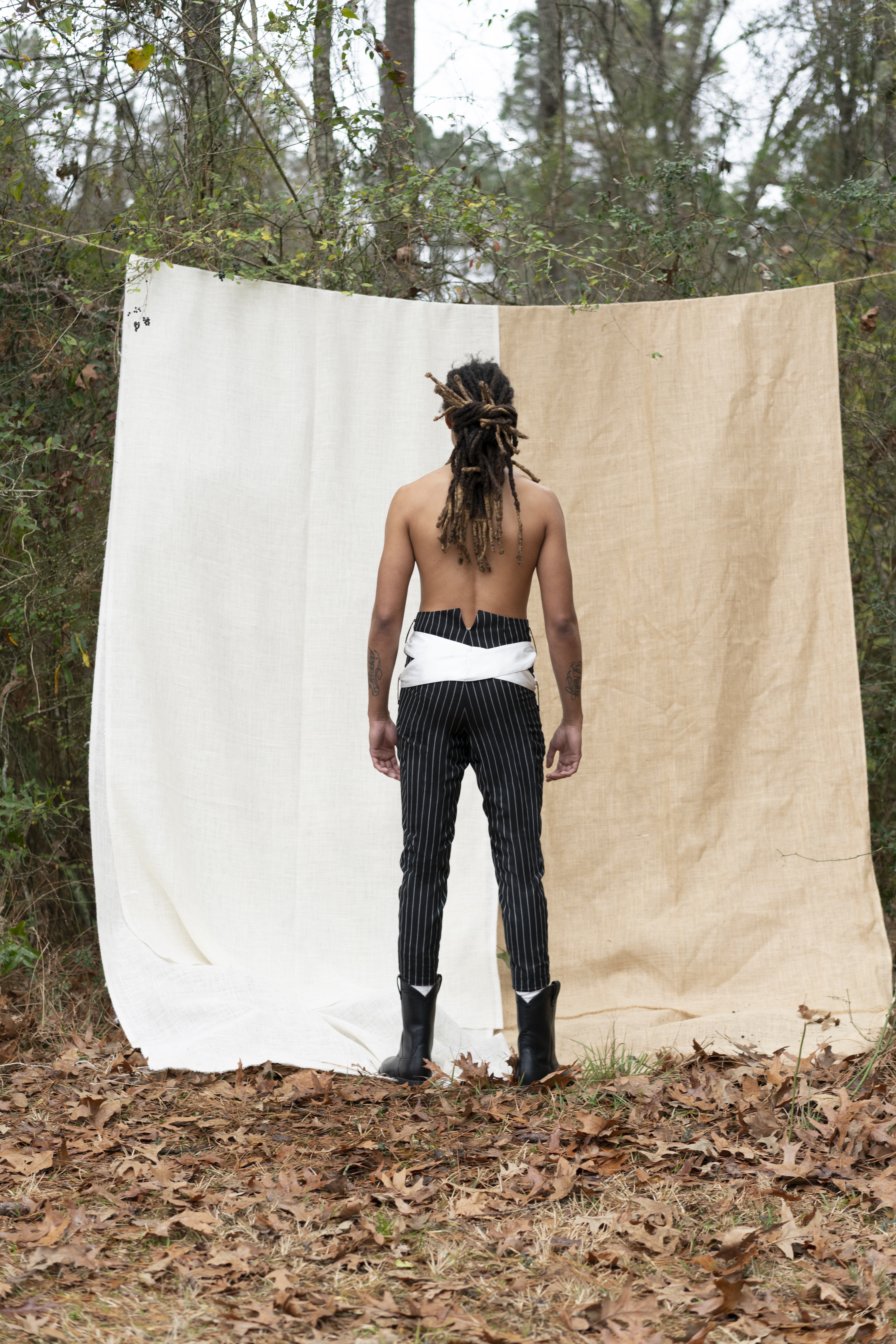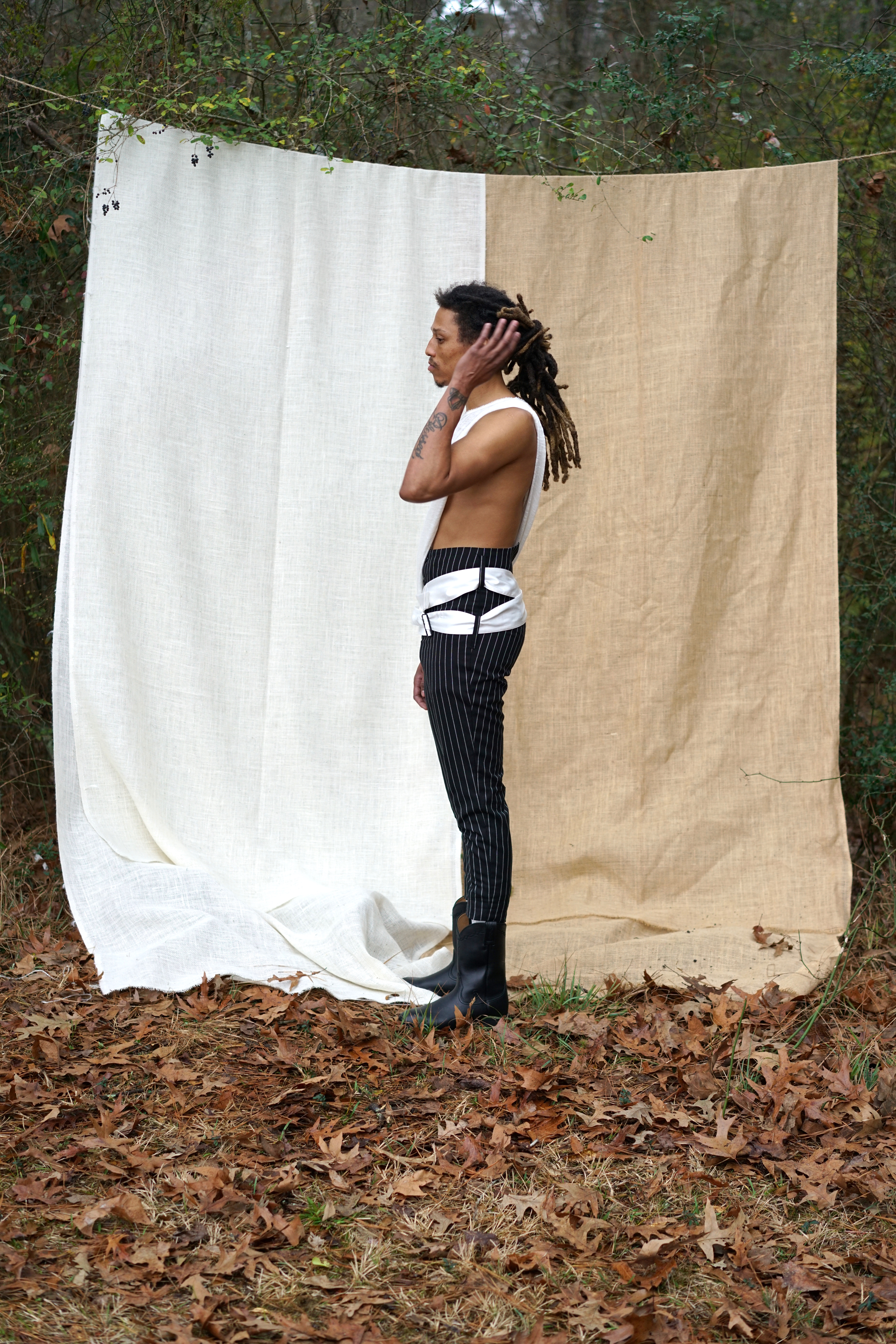 Woven pinstripe pants in black. Single watch pocket at waist. Tuck Cut at back. Horn button closures at front. Fold-over contrast silk lining. Includes dual elongated dropped belt loops. All items are made to order, ready within two to three months of payment. Sample fabric: 100% Wool Worsted, imported from Scotland. Belts: 100% Silk. Made in Oakland, Ca.